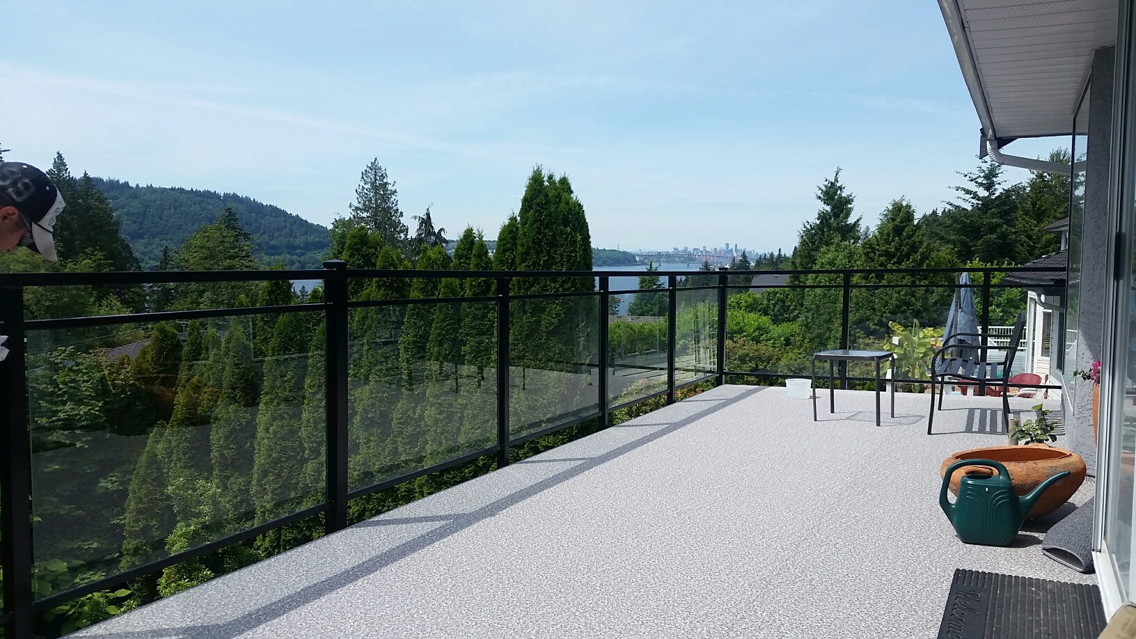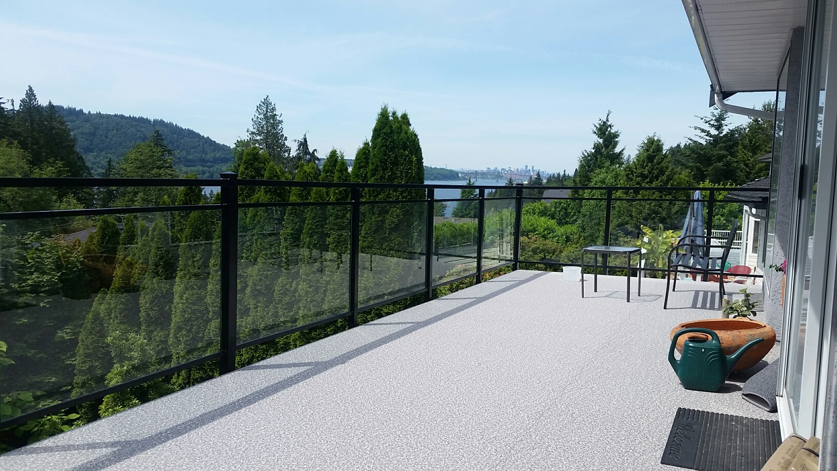 To update this deck, we installed new waterproofing vinyl membrane, double top aluminum glass railings, an angled privacy glass wind wall and built brand new set of stairs with matching double top picket railings. The before and after pictures capture this facelift well.